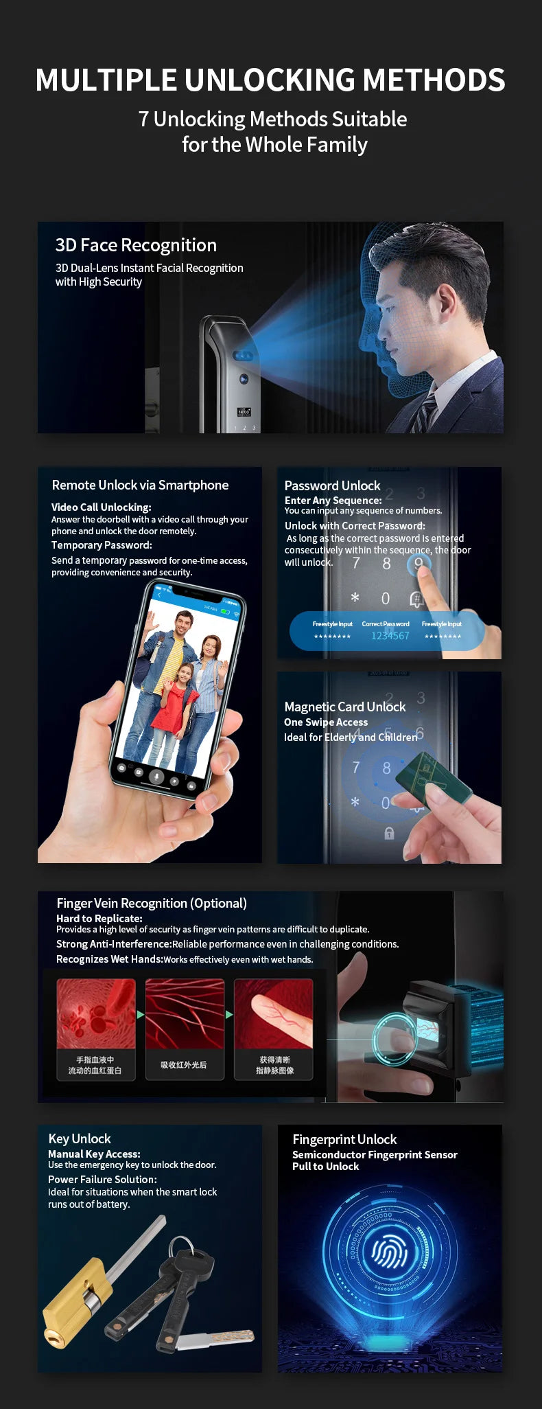• Gestion des utilisateurs – Jusqu'à 100 visages, 100 empreintes, 100 mots de passe et 100 cartes